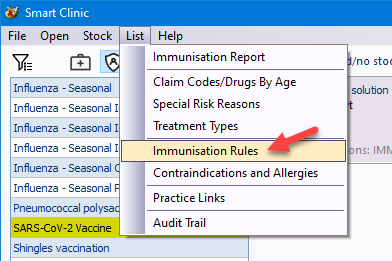 - Then click the List menu and select "Immunisation Rules", which will display all the COVID vaccines